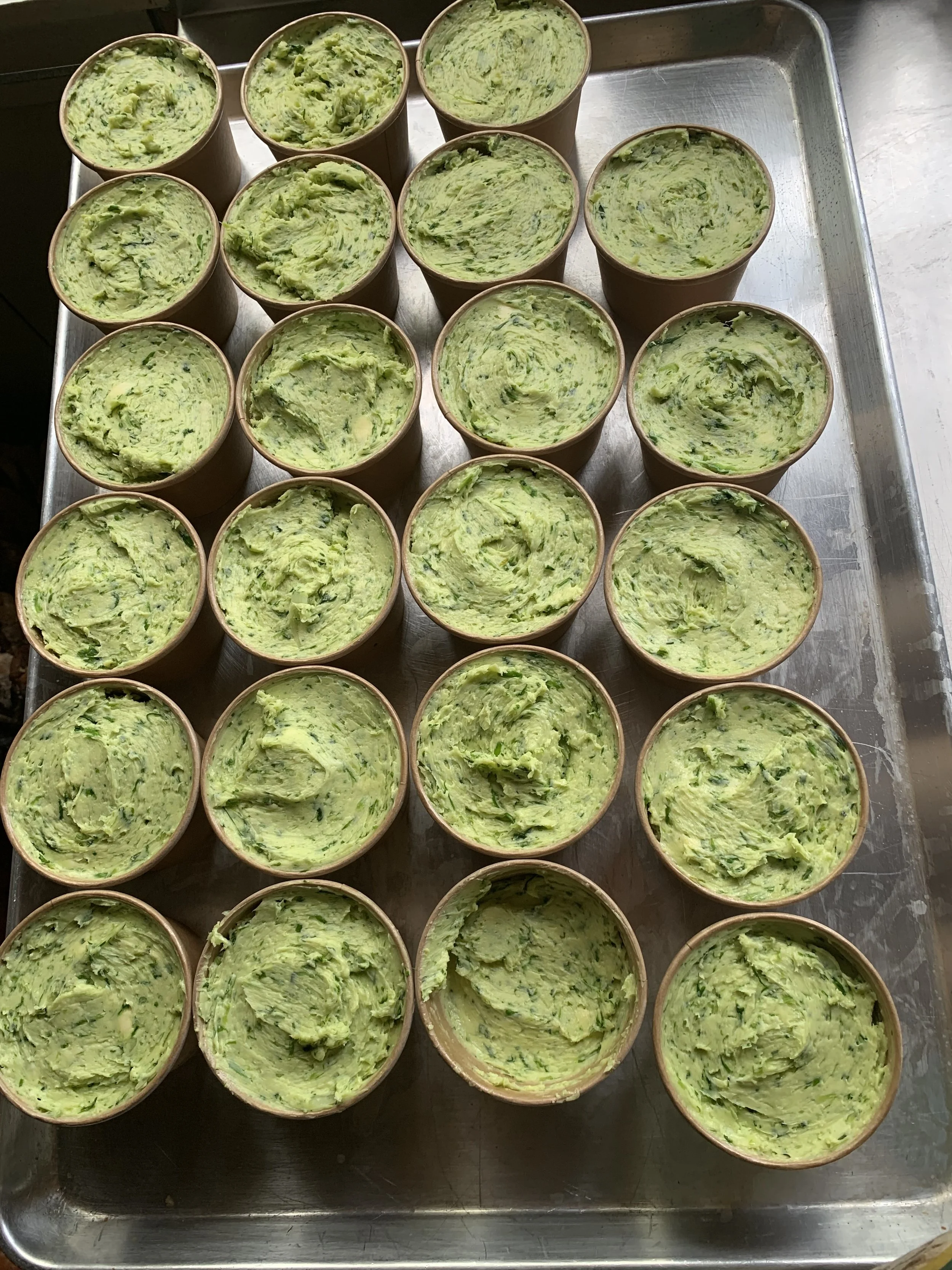 This is an 8oz container of compound ramp butter. Ramps are a wild leek known for their pungent onion/garlic flavor. This butter is great on bread but can also be used in various cooking applications. A little goes a long way!