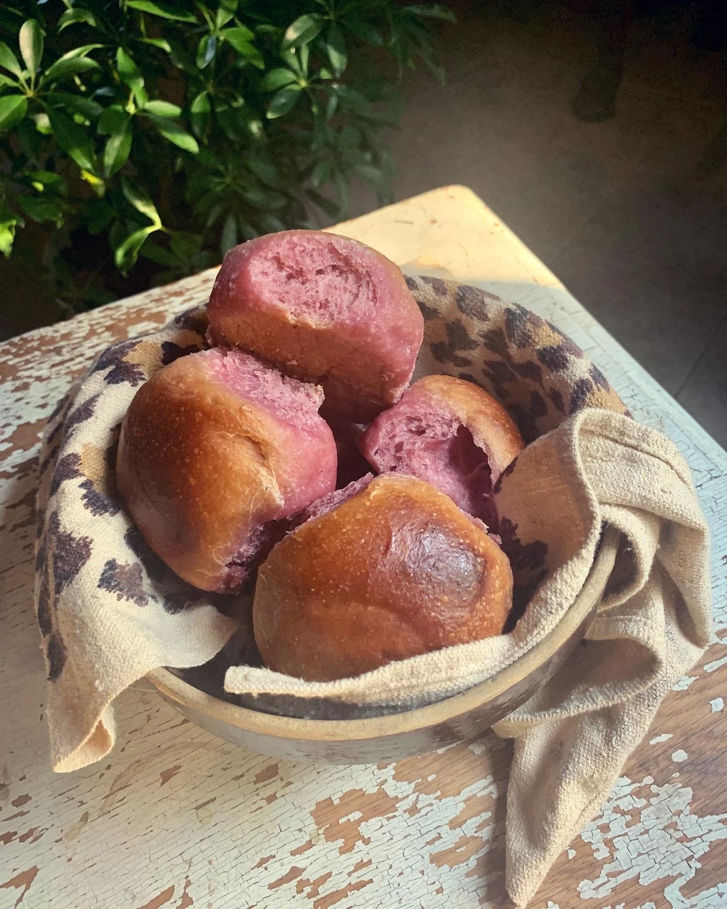 A soft roll enriched with local purple sweet potatoes, local pastured eggs, grass fed butter and milk. They are leavened with both yeast and sourdough culture. 9 dinner rolls to a pack.