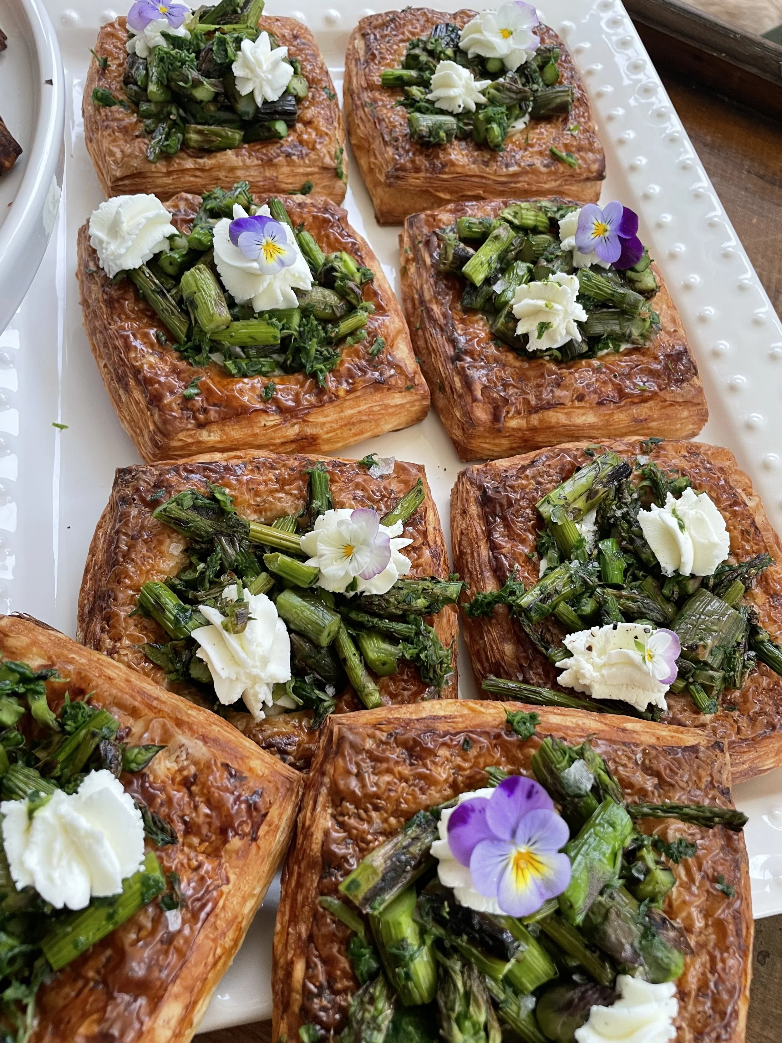 Ingredients: Organic Pa Wheat Flour, Organic NY Whole Spelt Flour, Grassfed Butter, Local Pastured Eggs,Amazing Acres Fromagina Goat Cheese, Local Asparagus, Local Ramps, Organic Cane Sugar,Pink Himalayan Salt, Yeast