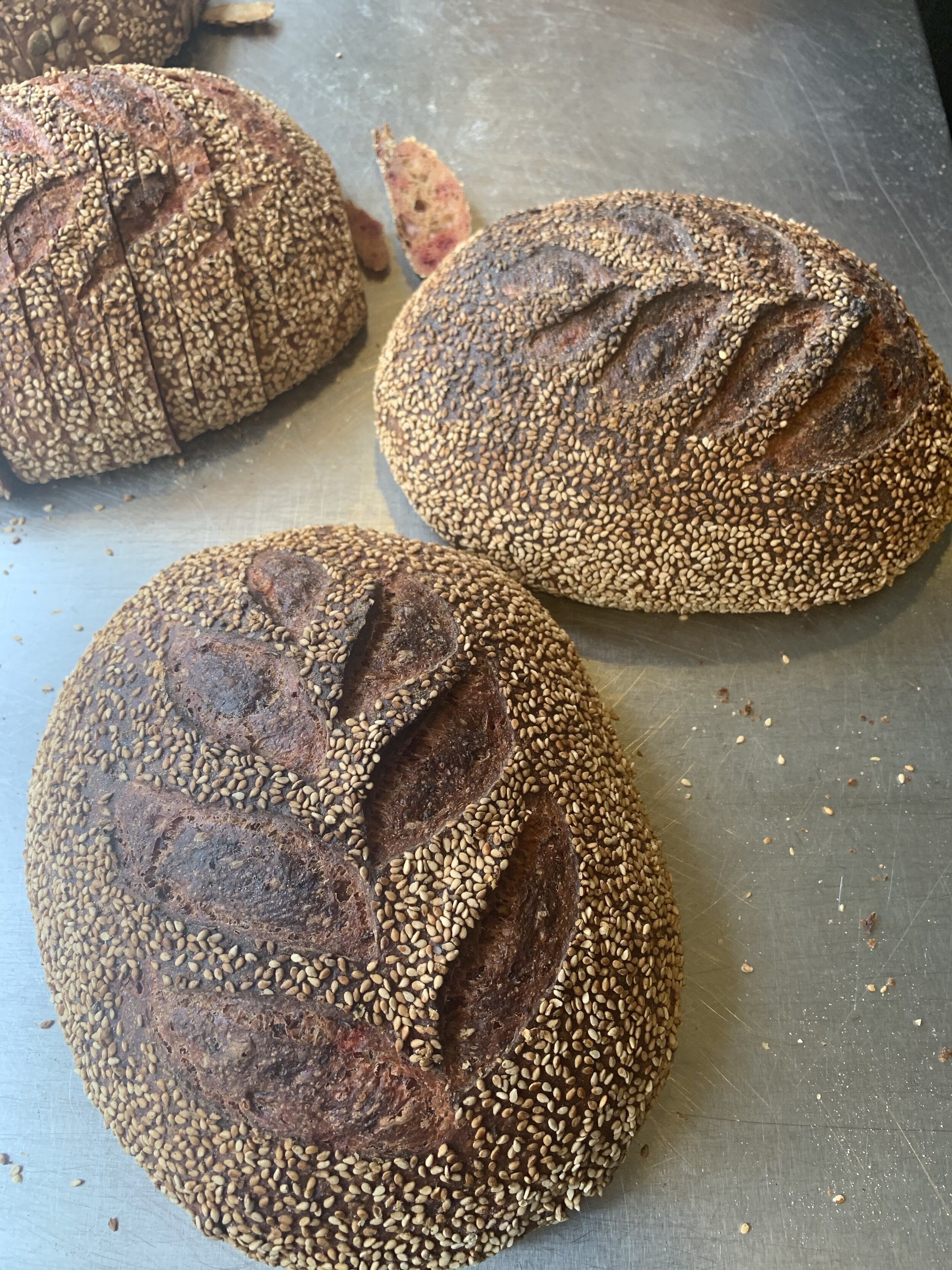 Our whole wheat sourdough made with stone ground Pennsylvania grown Hard Red Wheat and local organic pureed beets. Topped with sesame seeds for a rich and nutty flavor.
