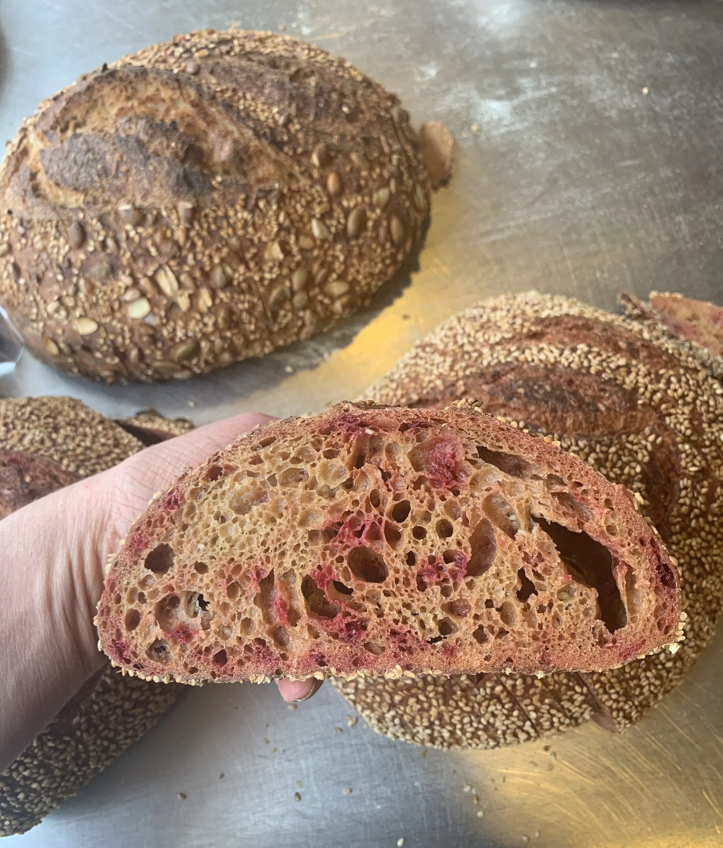 Ingredients: Organic PA Wheat Flour, Sourdough Culture, Water, Local Organic Red Beets, Organic Unhulled Sesame Seeds, Pink Himalayan Salt